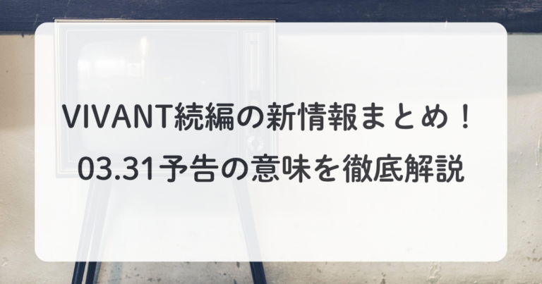 『VIVANT』続編の新情報が再び話題になっています。 中でも意味深に出された「03.31」の予告が何を示しているのか、気になっている方も多いのではないでしょうか。 今回はVIVANT続編の現時点で分かっている情報を整理 … 続きを読む VIVANT続編の新情報まとめ!03.31予告の意味を徹底解説